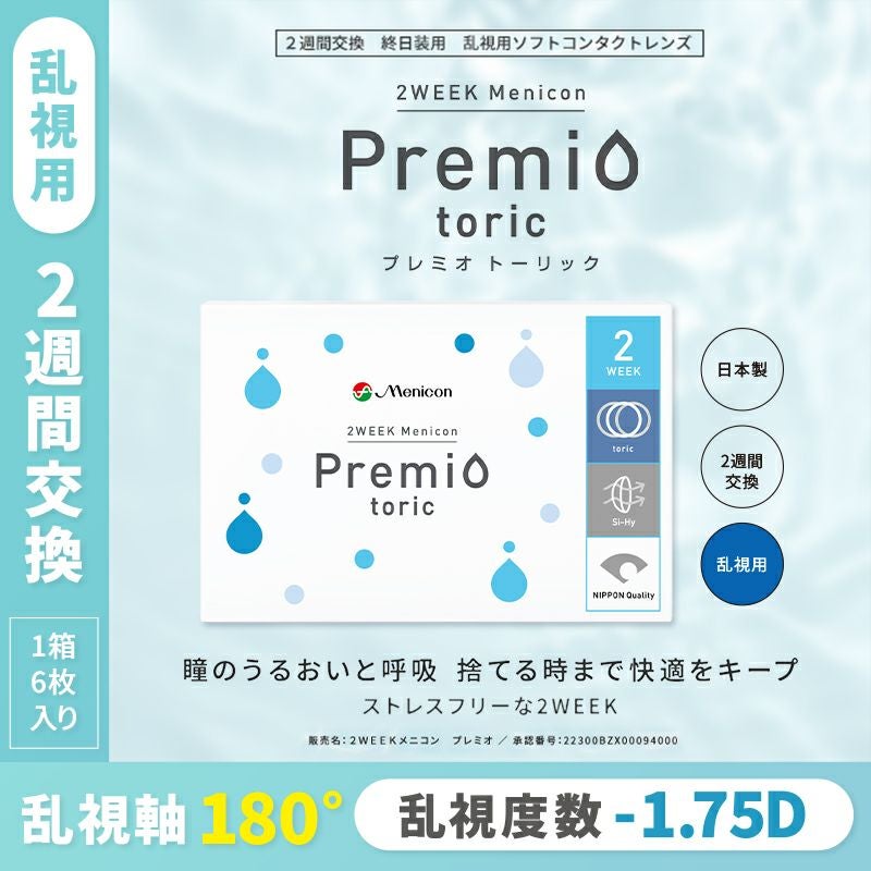 他の画像を見る 【即日発送NG】 【乱視用】2WEEK Menicon Premio toric ツーウィークメニコンプレミオトーリック -0.75D/180°(1箱6枚入り) 送料無料 ネコポス 乱視用 クリアレンズ 度ありのみ 2week DIA14.0mm BC8.6mm 含水率40% 販売価格 ¥ 2,310 税込 カートに入れる お気に入りに登録する