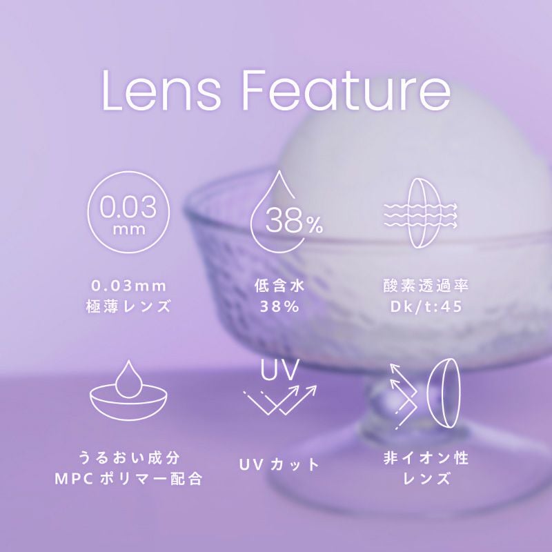 他の画像を見る 【即日発送NG】 PienAge ピエナージュ55% UV&MOIST NO.103 ベイビーメイ(1箱12枚入り) 送料無料 ネコポス UVカット うるおい成分 ナチュラル ハーフ瞳 パープル 1day DIA14.2mm 着色直径13.6㎜ BC8.6mm 含水率55% フチあり 販売価格 ¥ 1,760 税込 カートに入れる お気に入りに登録する
