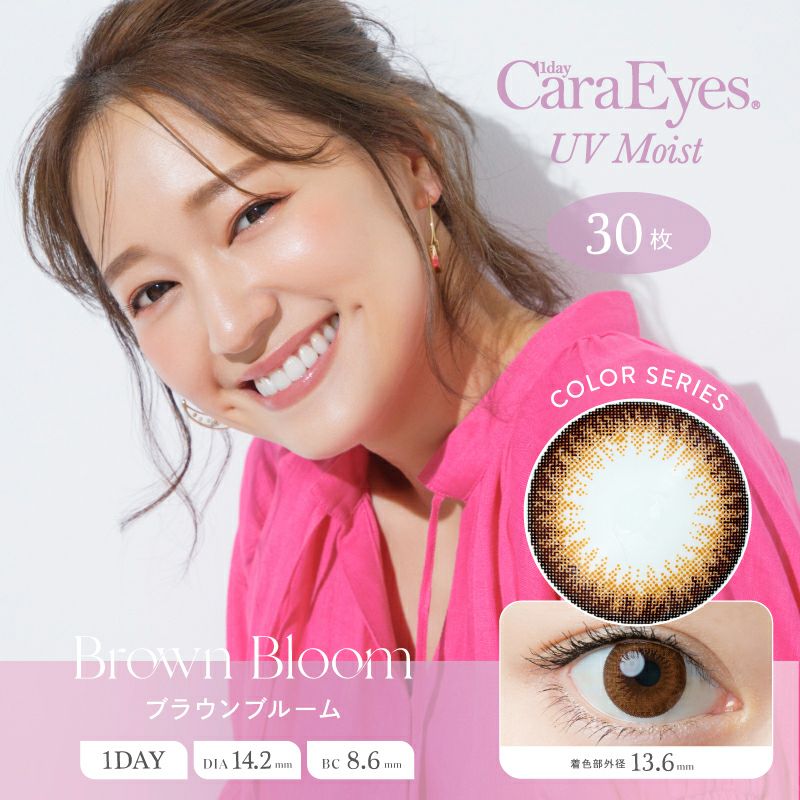 他の画像を見る 【即日発送NG】 1day Cara Eyes UV Moist Color Series ワンデーキャラアイ UVモイスト ブラウンブルーム(1箱30枚入り) 送料無料 UVカット 宅配便のみ うるおい成分 ナチュラル ブラウン 1day DIA14.2mm 着色直径13.6㎜ BC8.6mm 含水率42.5% フチあり 販売価格 ¥ 3,707 税込 カートに入れる お気に入りに登録する