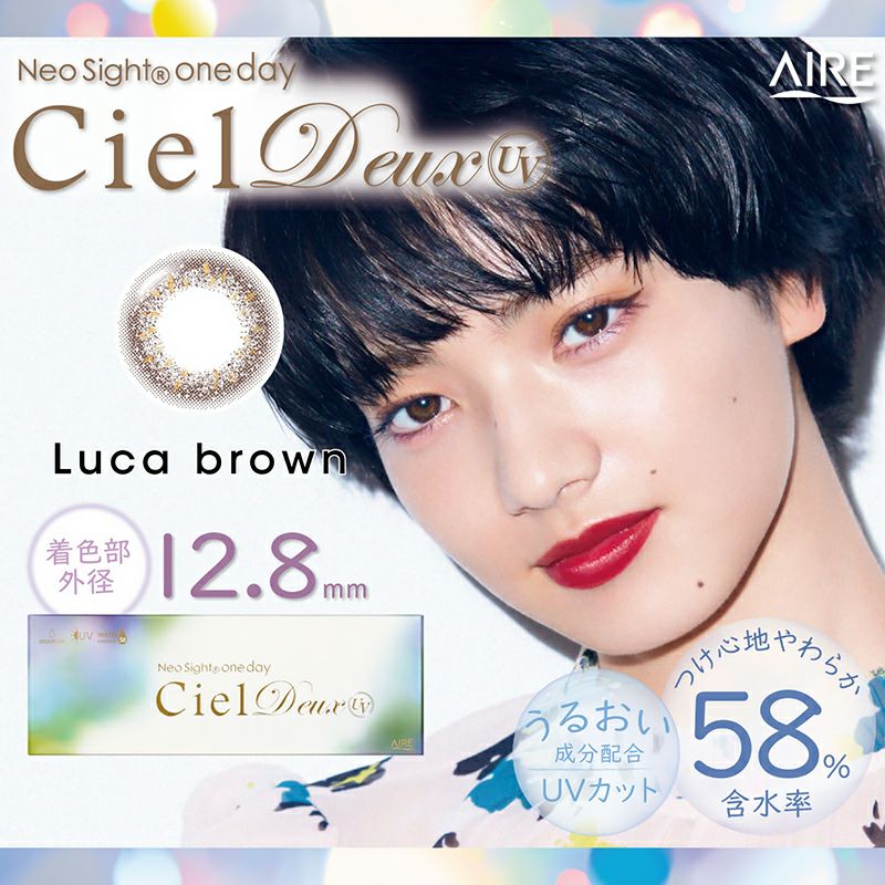 他の画像を見る 【在庫限りで終売】 NeoSight 1day CielDeux UV ネオサイトワンデー シエルデュウ UV ルカブラウン(1箱30枚入り) 送料無料 即日発送 UVカット 宅配便のみ うるおい成分 ナチュラル ブラウン 1day DIA14.2mm 着色直径12.9㎜以下 BC8.8mm 含水率58% フチあり 販売価格 ¥ 3,920 税込 完売 カートに入れる お気に入りに登録する