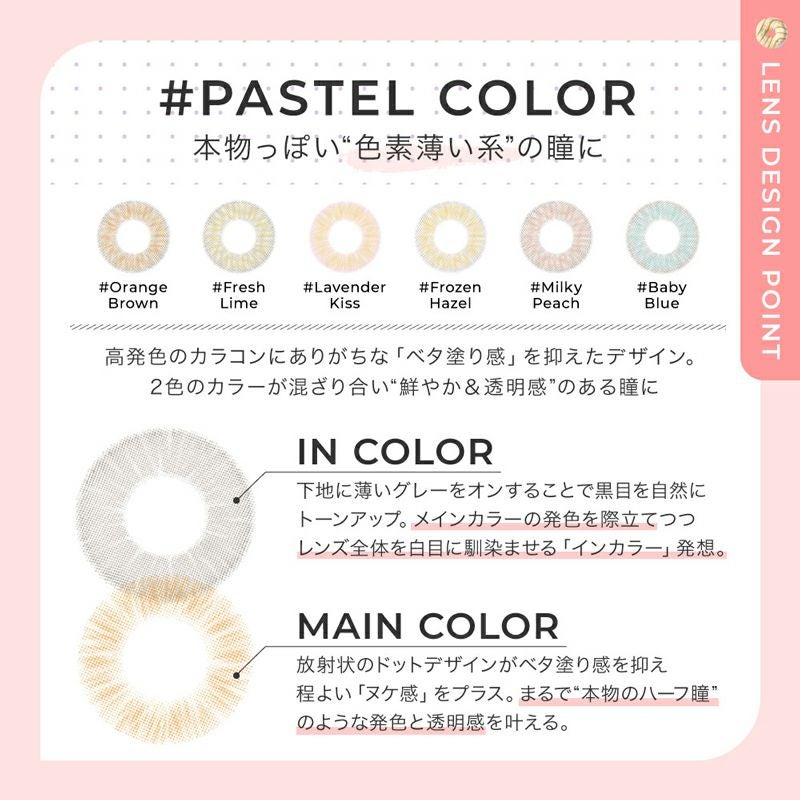 他の画像を見る 【即日発送NG】 1-DAY Refrear Riri Bunny リリバニー キャンディバニー(1箱10枚入り) 送料無料 ネコポス UVカット うるおい成分 ナチュラル ブラウン 1day DIA14.5mm 着色直径13.8㎜ BC8.7mm 含水率55% フチあり 販売価格 ¥ 1,100 税込 カートに入れる お気に入りに登録する