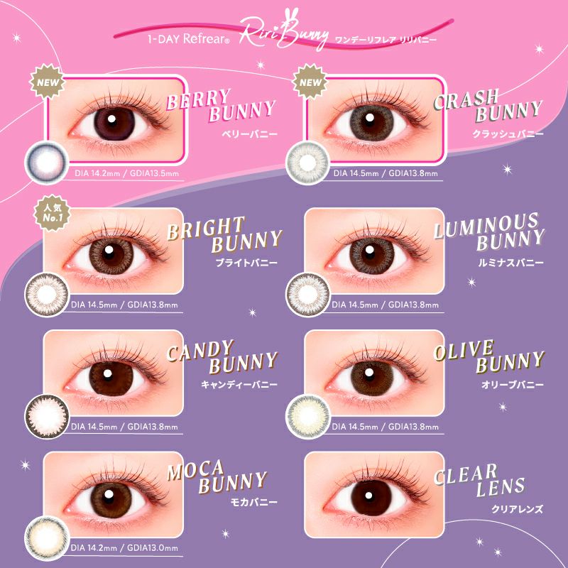 他の画像を見る 【即日発送NG】 1-DAY Refrear Riri Bunny リリバニー ルミナスバニー(1箱10枚入り) 送料無料 ネコポス UVカット うるおい成分 ハーフ瞳 ブラウン グレー 1day DIA14.5mm 着色直径13.8㎜ BC8.7mm 含水率55% フチあり 販売価格 ¥ 1,100 税込 カートに入れる お気に入りに登録する