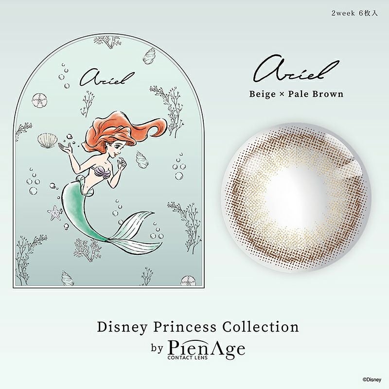 他の画像を見る 【即日発送NG】 Disney プリンセスコレクション <アリエル> ベージュ×ペールブラウン PienAge ピエナージュ 2week (1箱6枚入り) 送料無料 ネコポス UVカット うるおい成分 ナチュラル ブラウン 2week DIA14.2mm 着色直径13.2㎜ BC8.7mm 含水率55% フチあり 販売価格 ¥ 2,420 税込 カートに入れる お気に入りに登録する