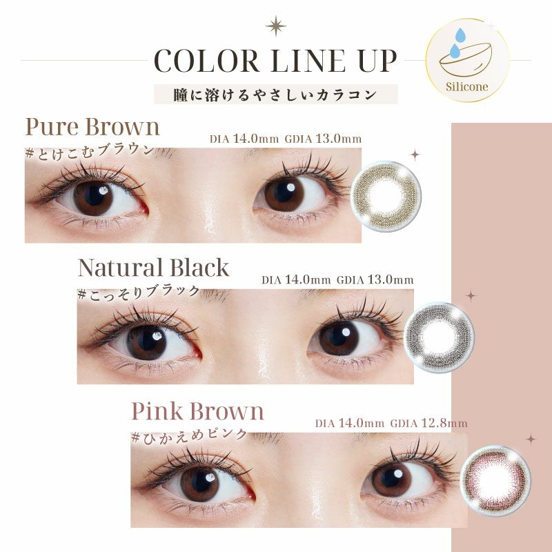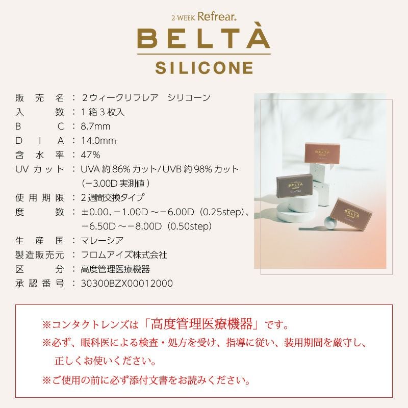 他の画像を見る 【即日発送NG】 2week Refrear BELTA ベルタ UV SILICONE ピンクブラウン (1箱3枚入り) 送料無料 ネコポス UVカット うるおい成分 シリコン ナチュラル ブラウン ピンク 2week DIA14.0mm 着色直径12.9㎜以下 BC8.7mm 含水率47% フチあり 販売価格 ¥ 1,100 税込 カートに入れる お気に入りに登録する