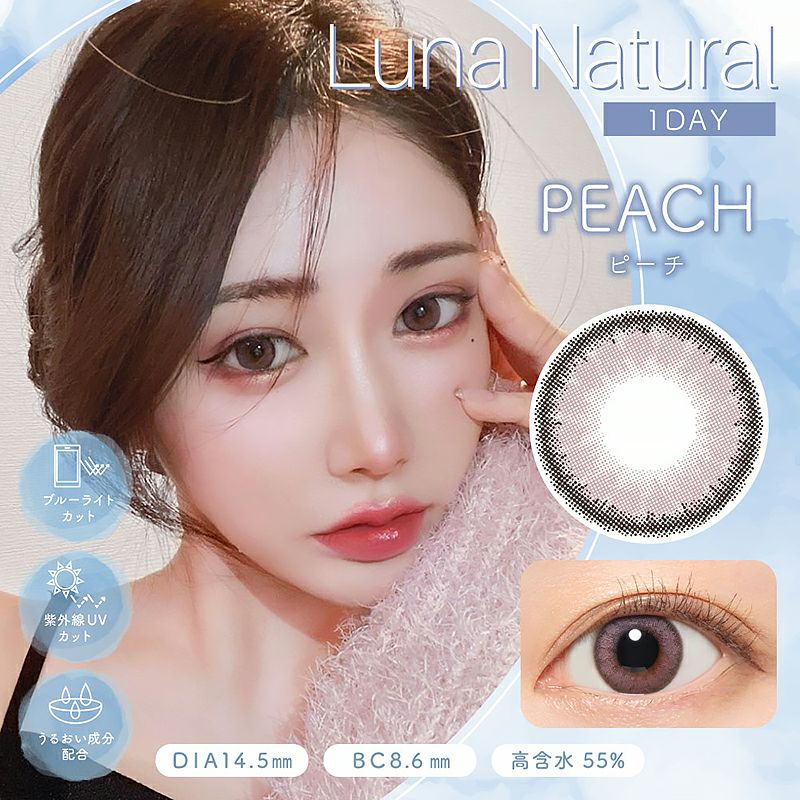 他の画像を見る 【即日発送NG】 【新色】LUNA Natural 1day ルナナチュラルワンデー ブルーライトカット ピーチ(1箱10枚入り) 送料無料 ネコポス UVカット うるおい成分 ブルーライト ナチュラル 色素薄い系 ピンク 1day DIA14.5mm 着色直径13.8㎜ BC8.6mm 含水率55% フチあり 販売価格 ¥ 1,870 税込 カートに入れる お気に入りに登録する