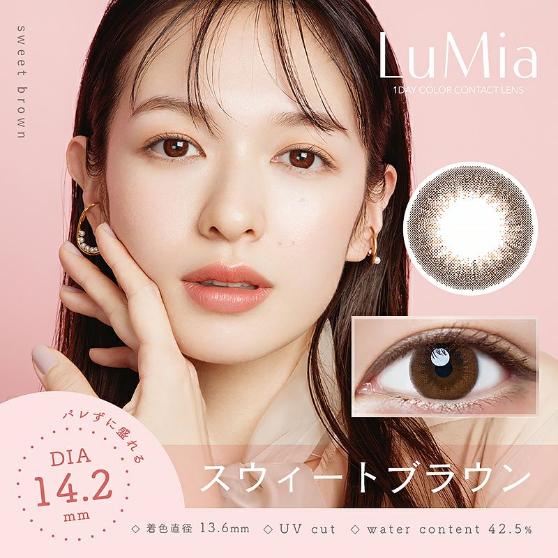 他の画像を見る 【即日発送NG】 LuMia 1day ルミア ワンデー 14.2mm スウィートブラウン (1箱10枚入り) 送料無料 ネコポス UVカット うるおい成分 ナチュラル ブラウン 1day DIA14.2mm 着色直径13.6㎜ BC8.7mm 含水率42.5% 販売価格 ¥ 1,815 税込 カートに入れる お気に入りに登録する