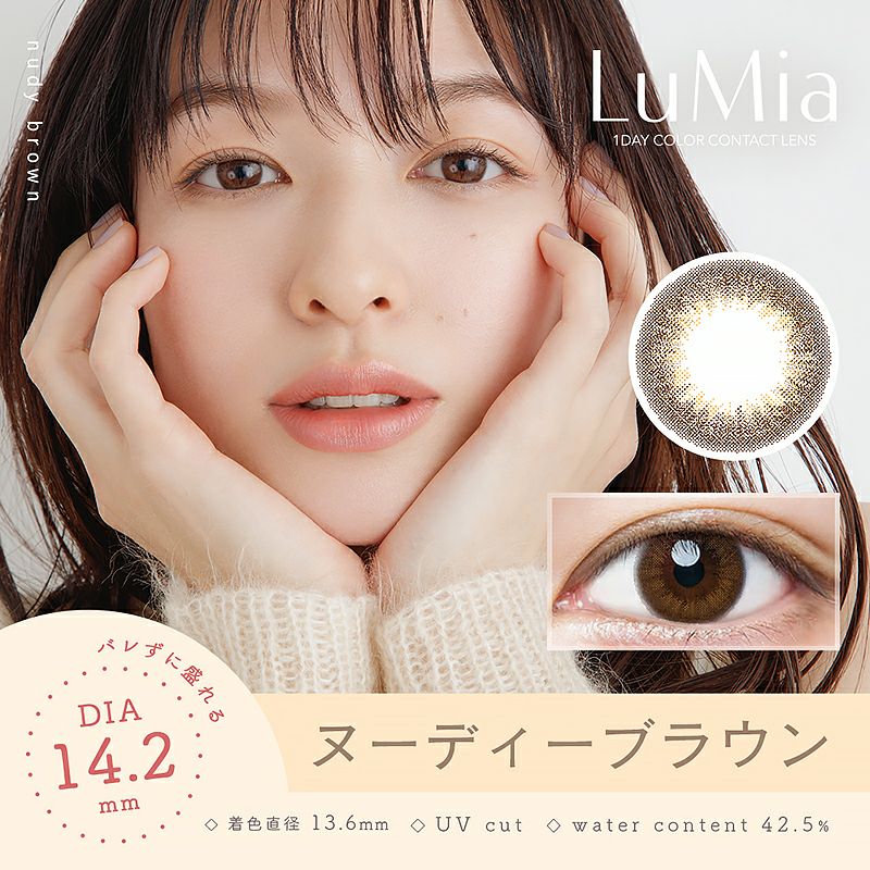 他の画像を見る 【即日発送NG】 LuMia 1day ルミア ワンデー 14.2mm ヌーディーブラウン (1箱10枚入り) 送料無料 ネコポス UVカット うるおい成分 ナチュラル ブラウン 1day DIA14.2mm 着色直径13.6㎜ BC8.7mm 含水率42.5% 販売価格 ¥ 1,815 税込 カートに入れる お気に入りに登録する
