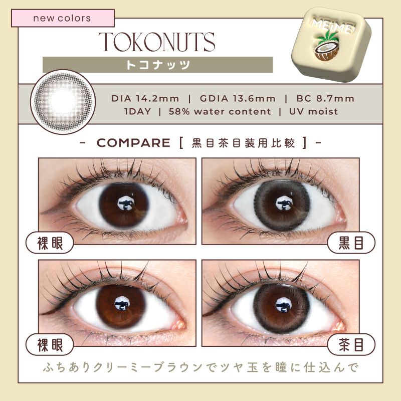 他の画像を見る 【即日発送OK♪】 MEiME! by LARME メイメ! by ラルム トコナッツ (1箱10枚入り) 送料無料 即日発送 ネコポス UVカット うるおい成分 ナチュラル ブラウン 1day DIA14.2mm 着色直径13.6㎜ BC8.7mm 含水率58% フチあり 3箱同時購入で1箱分無料! 販売価格 ¥ 1,760 税込 カートに入れる お気に入りに登録する