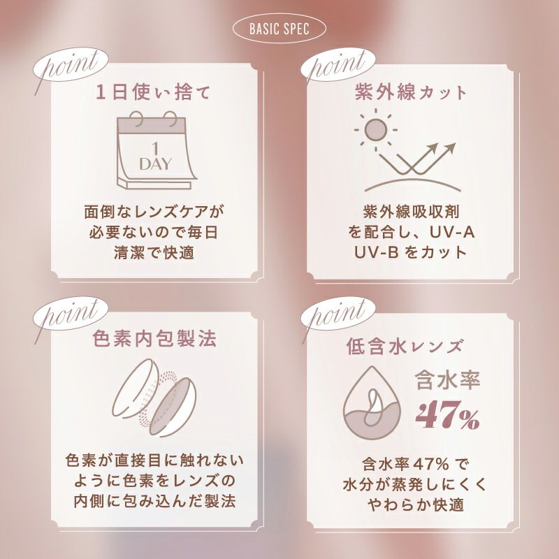 他の画像を見る 【即日発送OK♪】 Uyu 1DAY ウユワンデー ダークバニー(1箱10枚入り) 送料無料 即日発送 ネコポス ナチュラル ピンク 1day DIA15.0mm 着色直径14.0㎜以上 BC8.7mm 含水率38% フチあり 販売価格 ¥ 1,760 税込 カートに入れる お気に入りに登録する