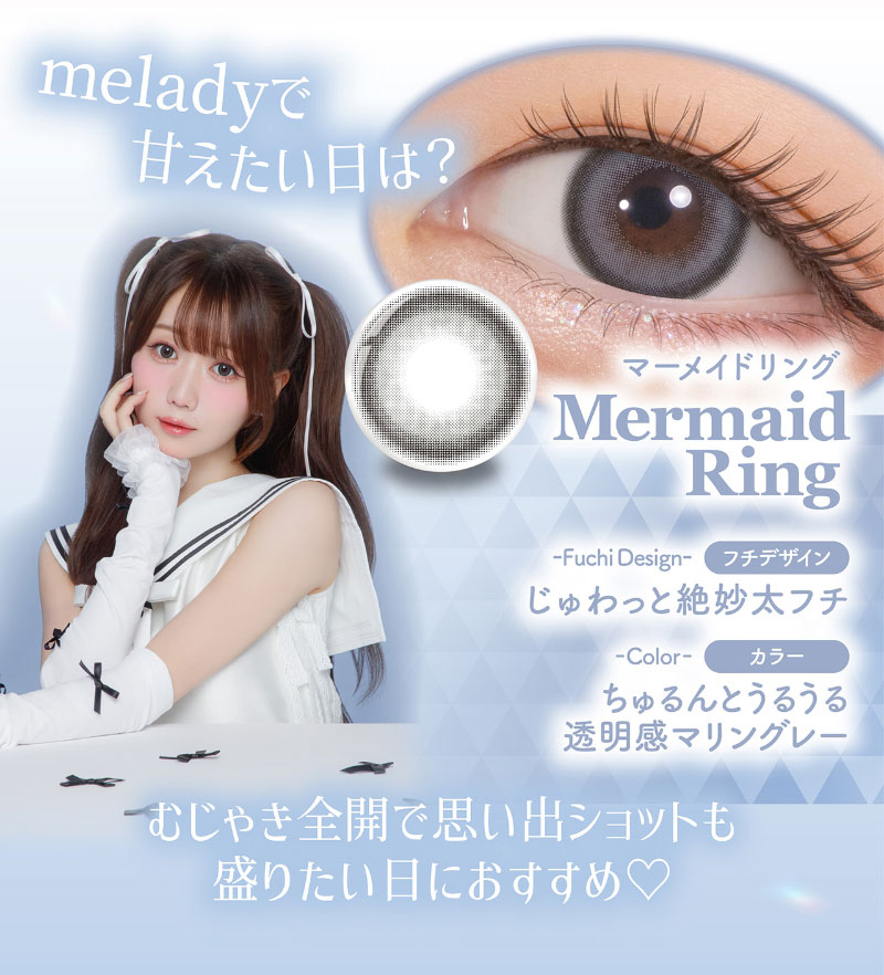 他の画像を見る 【即日発送OK♪】 melady ミレディ マーメイドリング(1箱10枚入り) 送料無料 即日発送 ネコポス UVカット ハーフ瞳 色素薄い系 グレー 1day DIA14.5mm 着色直径13.8㎜ BC8.6mm 含水率55% フチあり 販売価格 ¥ 1,485 税込 カートに入れる お気に入りに登録する