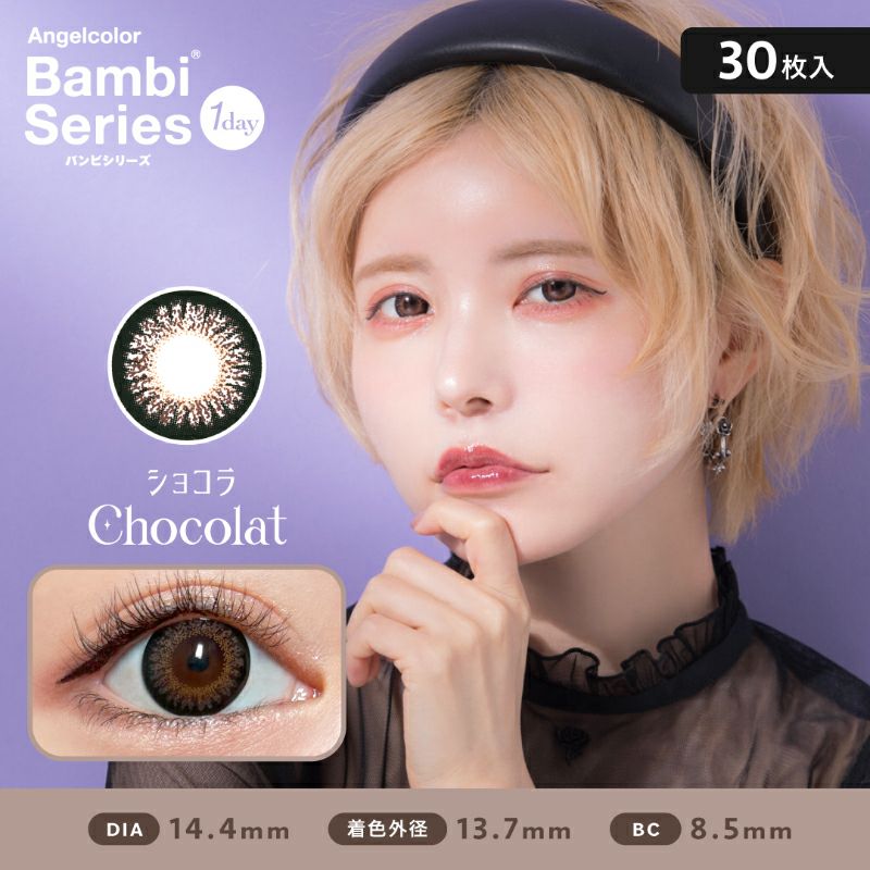 他の画像を見る 【在庫限りで販売終了】 AngelColor Bambi Series 1day エンジェルカラー バンビシリーズワンデー ショコラ(1箱30枚入り) 送料無料 即日発送 ネコポス UVカット 宅配便のみ うるおい成分 ナチュラル ブラウン 1day DIA14.4mm 着色直径13.7㎜ BC8.5mm 含水率58% フチあり 販売価格 ¥ 2,970 税込 完売 カートに入れる お気に入りに登録する