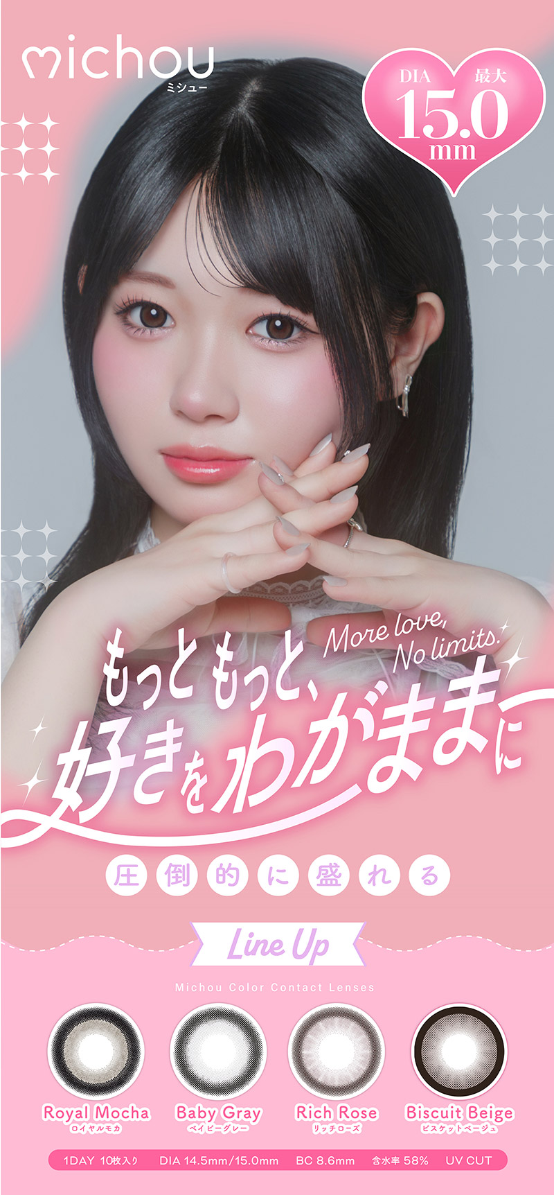 他の画像を見る 【即日発送NG】 michou ミシュー ベイビーグレー(1箱10枚入り) 送料無料 ネコポス UVカット うるおい成分 ハーフ瞳 グレー 1day DIA15.0mm 着色直径14.0㎜以上 BC8.6mm 含水率58% フチあり 販売価格 ¥ 1,474 税込 カートに入れる お気に入りに登録する