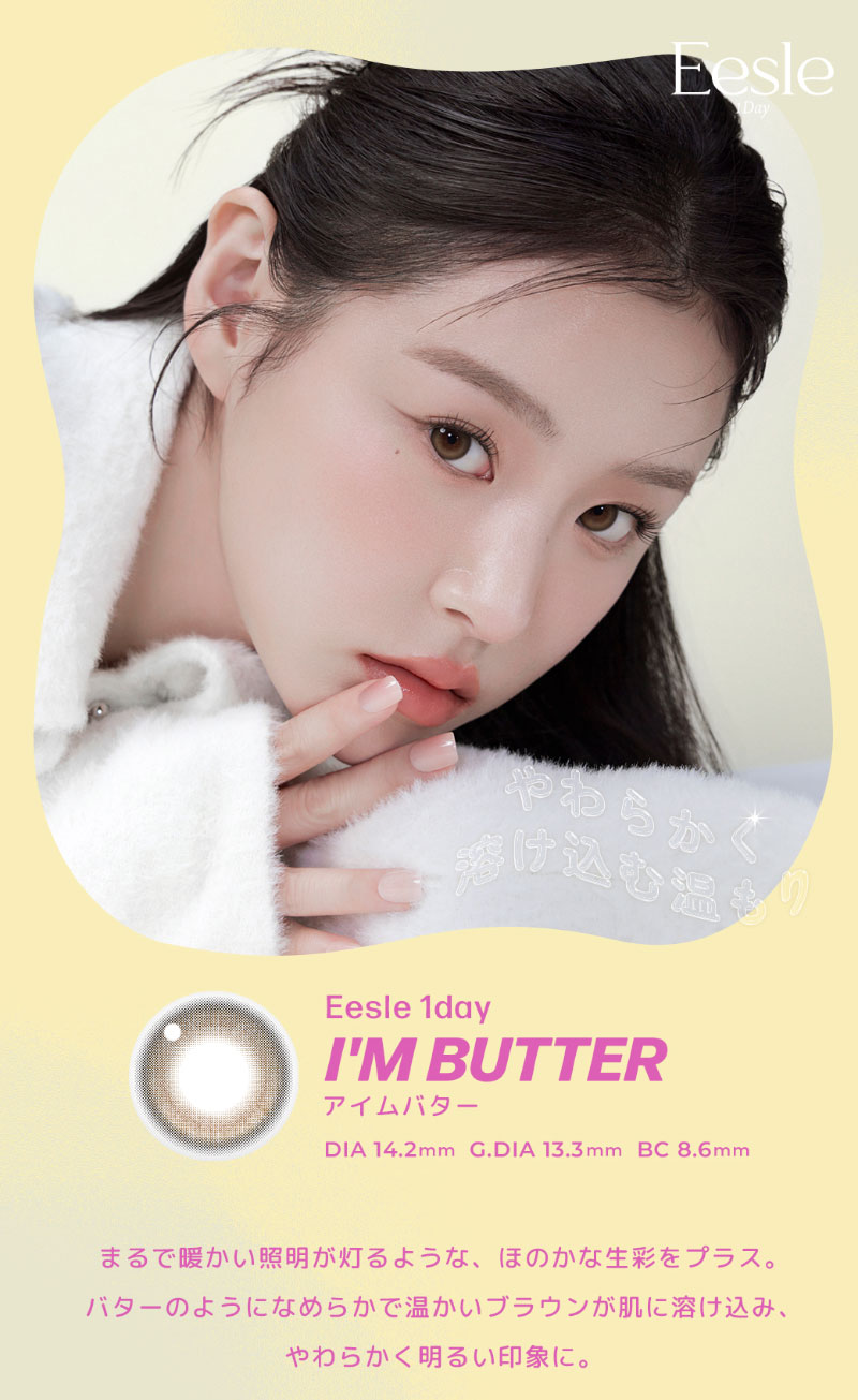 他の画像を見る 【即日発送OK♪】 Eesle 1day イスルワンデー アイムバター(1箱10枚入り) 送料無料 即日発送 ネコポス ナチュラル 色素薄い系 ブラウン 1day DIA14.2mm 着色直径13.3㎜ BC8.6mm 含水率38.5% フチあり 販売価格 ¥ 1,890 税込 カートに入れる お気に入りに登録する