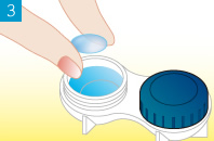 レンズケースに洗浄保存液を満たし、レンズを完全に液中に沈めてください。そのまま決められた時間放置し、消毒をしてください。消毒後はそのままレンズを取り出し装着してください。