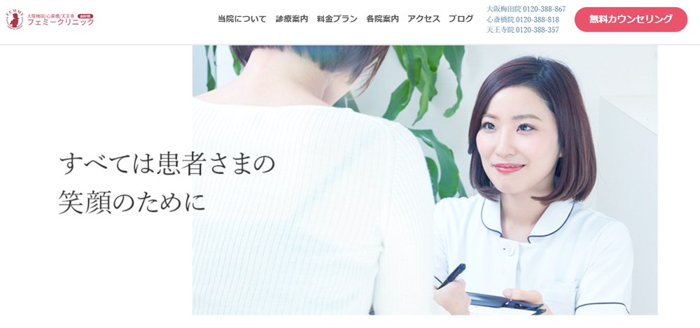 フェミークリニックは、大阪梅田・心斎橋・天王寺の3院で展開する美容皮膚科クリニックです。「全ては患者さまの笑顔のために」を基本理念に掲げ、医師・スタッフ全員がホスピタリティの精神を持って患者一人ひとりに寄り添った医療を心がけています。