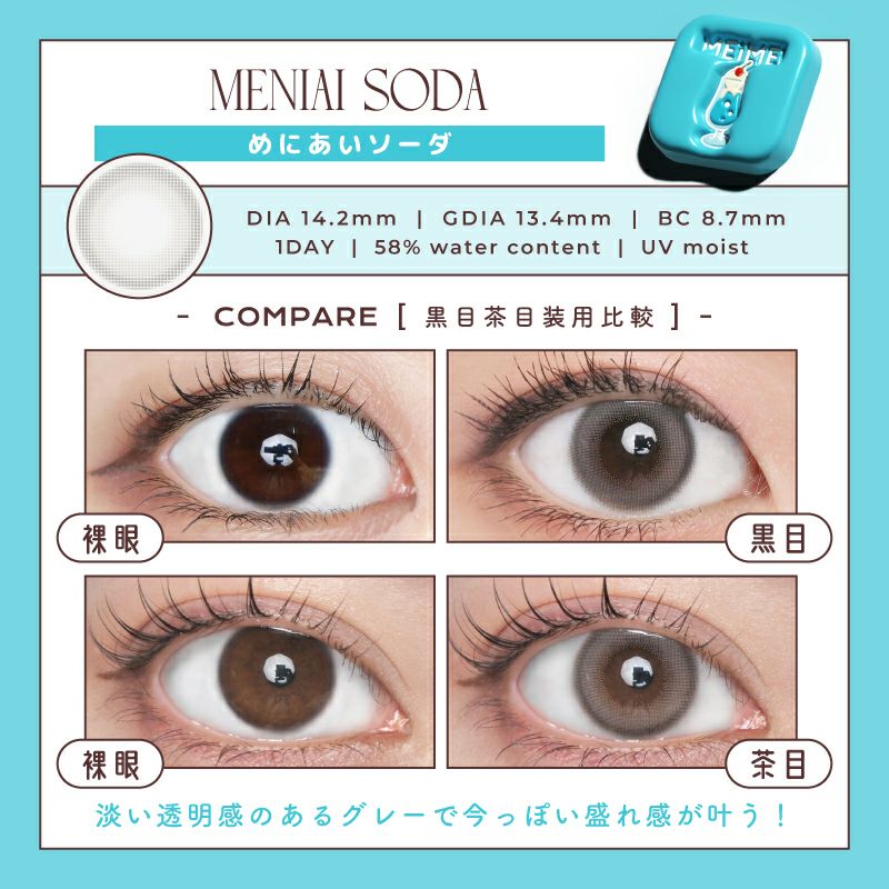 他の画像を見る 【即日発送OK♪】 MEiME! by LARME メイメ! by ラルム めにあいソーダ (1箱10枚入り) 送料無料 即日発送 ネコポス UVカット うるおい成分 ナチュラル 色素薄い系 グレー 1day DIA14.2mm 着色直径13.4㎜ BC8.7mm 含水率58% フチあり 3箱同時購入で1箱分無料! 販売価格 ¥ 1,760 税込 カートに入れる お気に入りに登録する