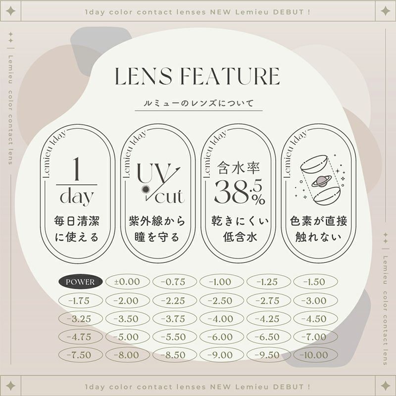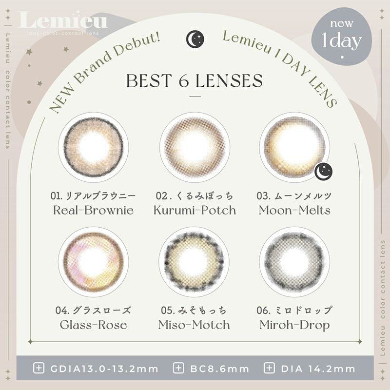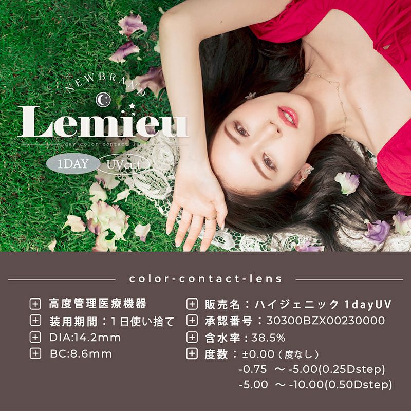 他の画像を見る 【即日発送NG】 Lemieu ルミュー ミロドロップ(1箱10枚) 送料無料 ネコポス UVカット ナチュラル グレー 1day DIA14.2mm 着色直径13.0㎜ BC8.6mm 含水率38.5% フチあり 販売価格 ¥ 1,705 税込 カートに入れる お気に入りに登録する
