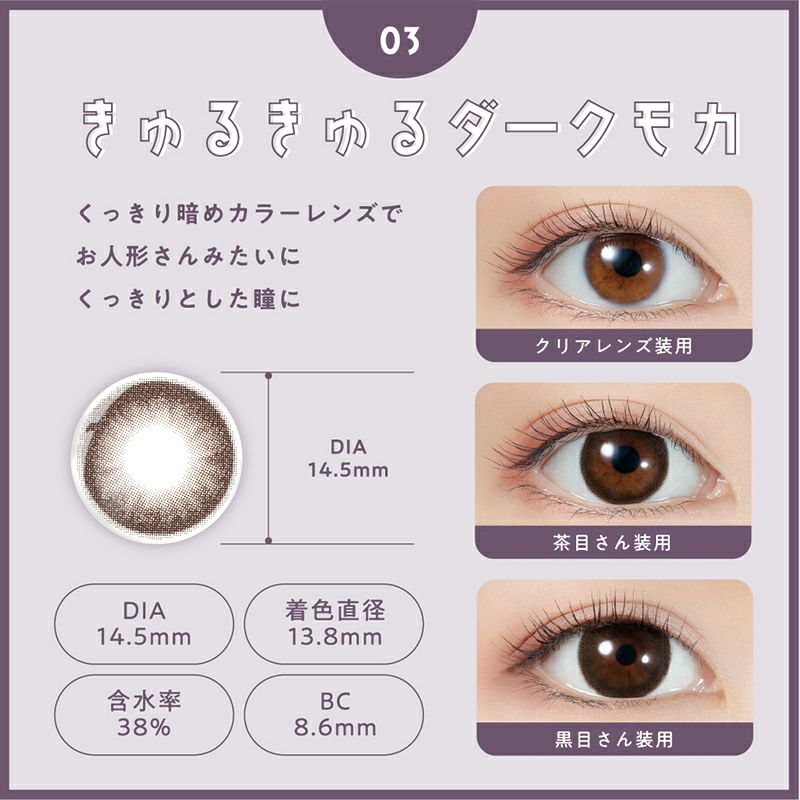 他の画像を見る 【即日発送NG】 PUUUUCHU 1day プーチュ きゅるきゅるダークモカ(1箱10枚入り) 送料無料 ネコポス UVカット うるおい成分 ナチュラル ブラック ブラウン 1day DIA14.5mm 着色直径13.8㎜ BC8.6mm 含水率38% フチあり 販売価格 ¥ 1,650 税込 カートに入れる お気に入りに登録する