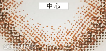 ブラックとブラウンの2トーンカラコンで全体的に隙間が多いデザイン。ブラックドットが外側に着色されていて、ブラックと重なり外側から内側までブラウンドットが着色されています。着色直径14.0mmなのでDIAの割に大きく感じます。