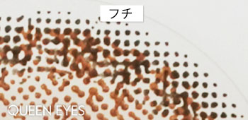 全体的に隙間が多く透明感があり、瞳にうまく馴染んでくれそうです。レンズ外側までしっかり着色されていますが、一番外側のブラックドットは隙間が多いので白目の透けが気になります。