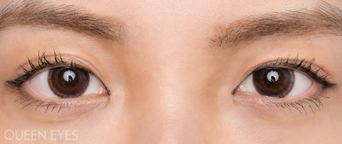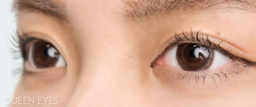 フチの濃いめのブラウンはレンズの見た目通りの発色をしていますが、内側の発色は落ち着いたくすみ系のブラウンに見えます。上品な色味でちゅるんとした艶感があります。薄づきで目立たなかったオレンジベージュは意外と発色していて、明るめのオレンジブラウンになりました!瞳孔周りにアクセントをプラスしてくれます。